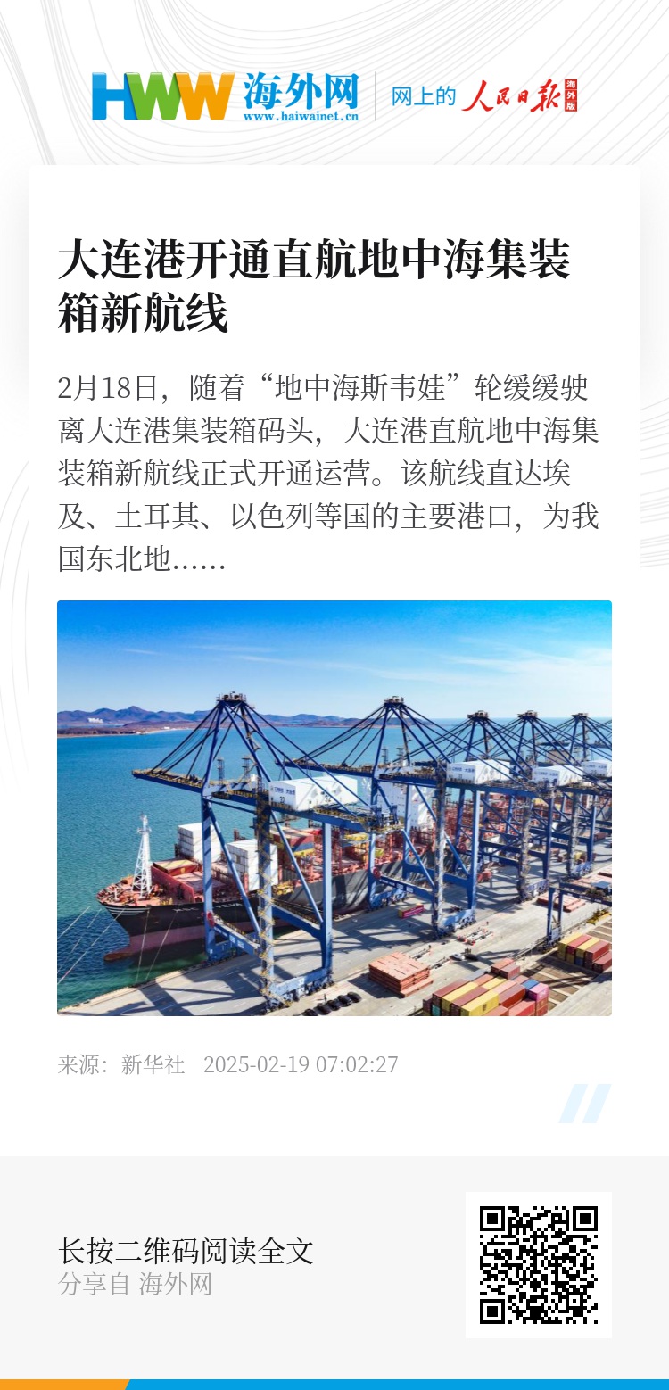 2月18日,随着“地中海斯韦娃”轮缓缓驶离大连港集装箱码头,大连港直航地中海集装箱新航线正式开通运营。该航线直达埃及、土耳其、以色列等国的主要港口,为我国东北地区与地中海沿岸国家之间架起一条稳定、便捷的海上物流新通道。