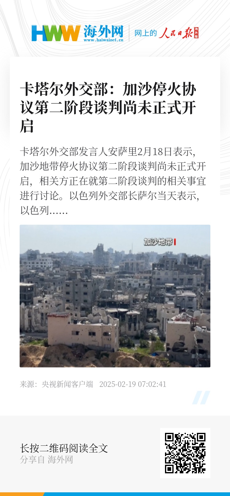 卡塔尔外交部发言人安萨里2月18日表示,加沙地带停火协议第二阶段谈判尚未正式开启,相关方正在就第二阶段谈判的相关事宜进行讨论。
