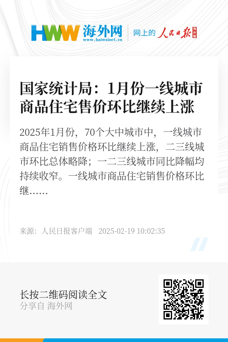 2025年1月份,70个大中城市中,一线城市商品住宅销售价格环比继续上涨,二三线城市环比总体略降;一二三线城市同比降幅均持续收窄。