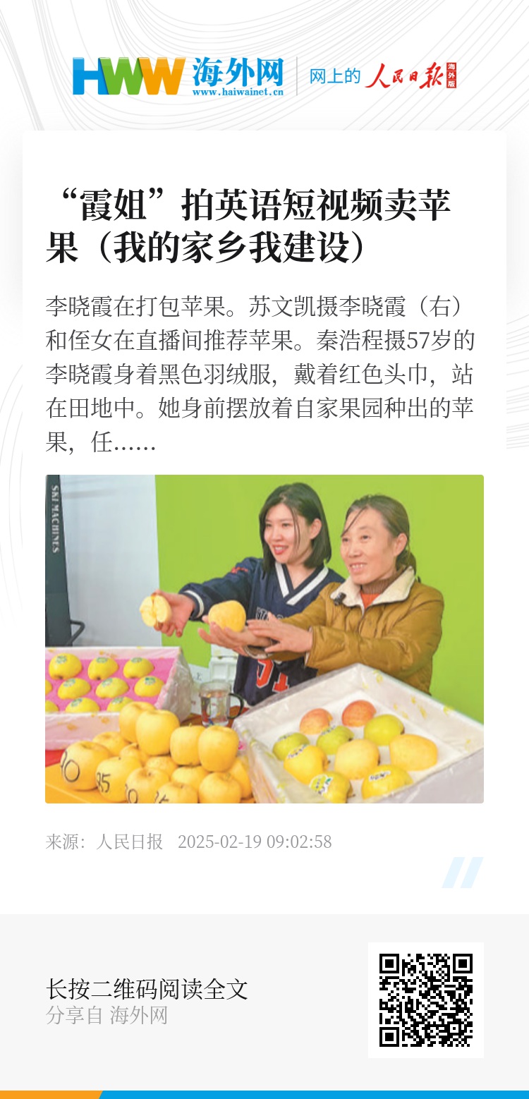 “姑姑,咱干脆把视频拍起来试一试!”今年农历大年初一,看到李晓霞还在顶着寒风满城送苹果,李少燕很是心疼,她决定再鼓励李晓霞试试。“果农用英语推介产品,发出来年轻人一准爱看。”这次,面对李少燕的热情邀请,李晓霞一口答应了下来。