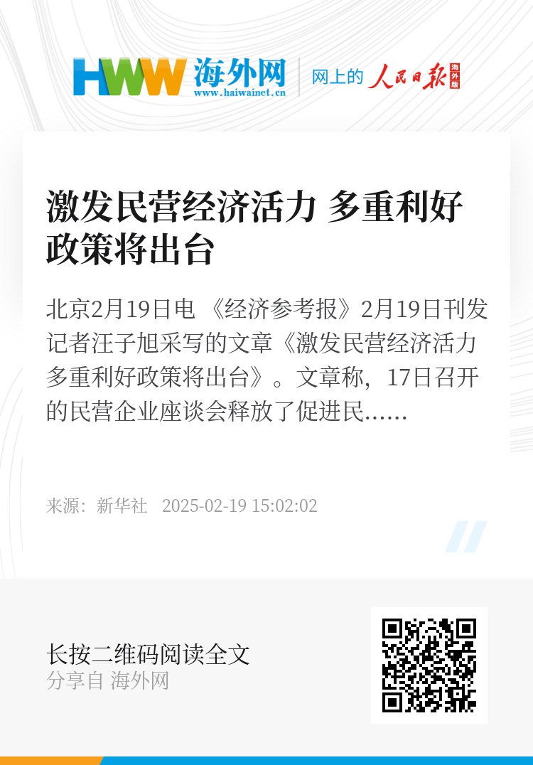 新华社北京2月19日电 《经济参考报》2月19日刊发记者汪子旭采写的文章《激发民营经济活力 多重利好政策将出台》。文章称,17日召开的民营企业座谈会释放了促进民营经济健康发展、高质量发展的重要信号。记者获悉,下一步,包括进一步破除市场准入障碍在内的多重民营经济利好政策将出台。相关部门将尽快修订出台新版市场准入负面清单,持续推进基础设施竞争性领域、国家重大科研基础设施等向民营企业公平开放,同时,进一步健全法律法规,强化失信惩戒,推动解决拖欠民营企业账款问题。