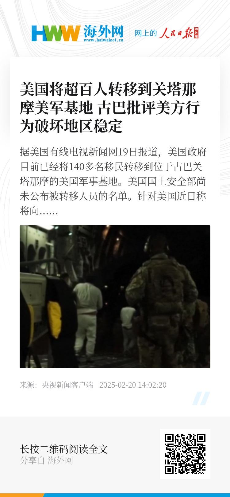 针对美国近日称将向关塔那摩美军基地安置移民,古巴方面此前批评美国这一不负责任的决定,会给地区带来危险,破坏地区稳定,并重申美国在关塔那摩设立军事基地是非法占领古巴领土。