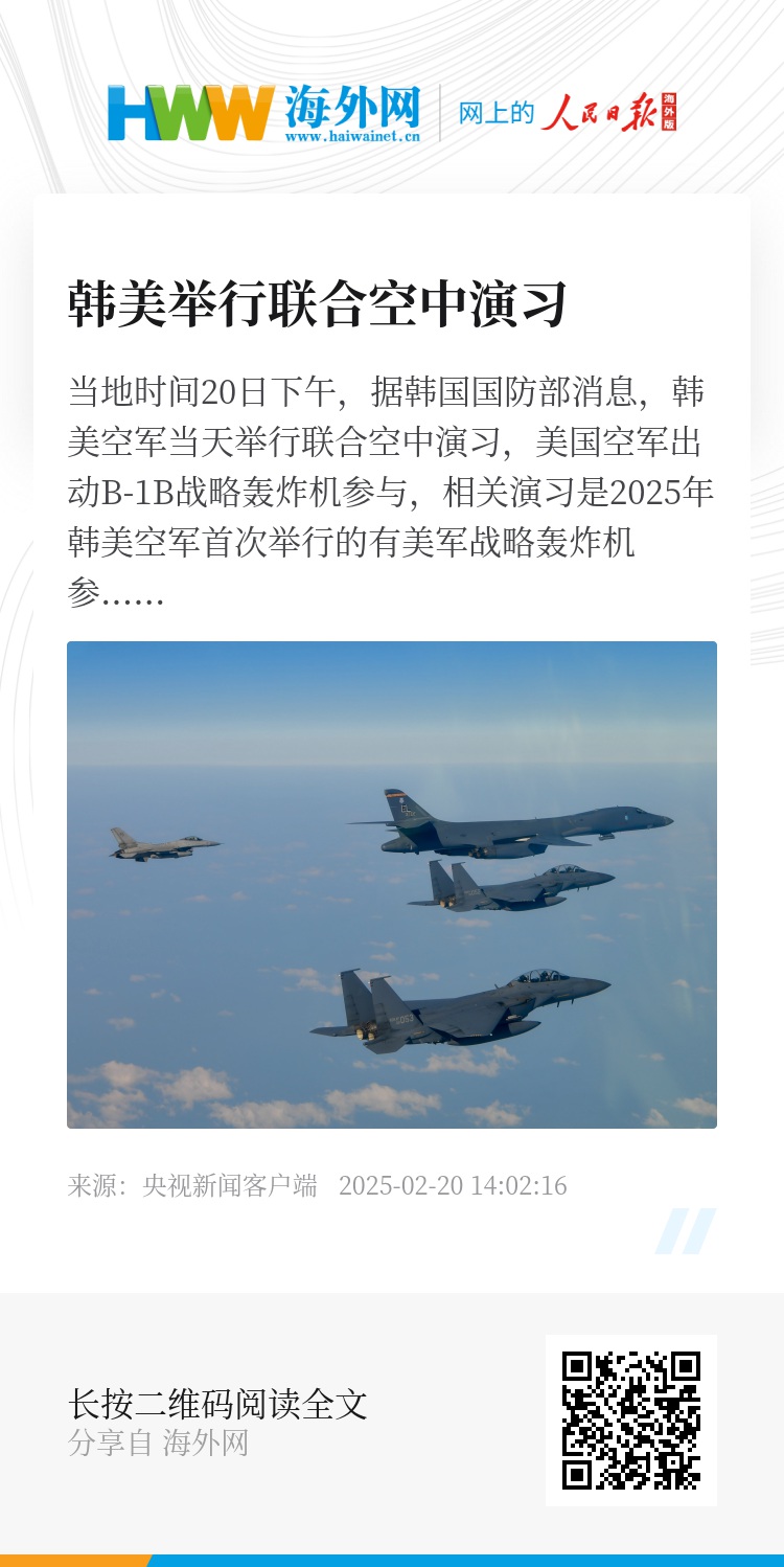 当地时间20日下午,据韩国国防部消息,韩美空军当天举行联合空中演习,美国空军出动B-1B战略轰炸机参与,相关演习是2025年韩美空军首次举行的有美军战略轰炸机参与的演习。韩国空军F-35A、F-15K以及美国空军F-16战斗机等也参与了当天的演习。(总台记者 唐鑫)
