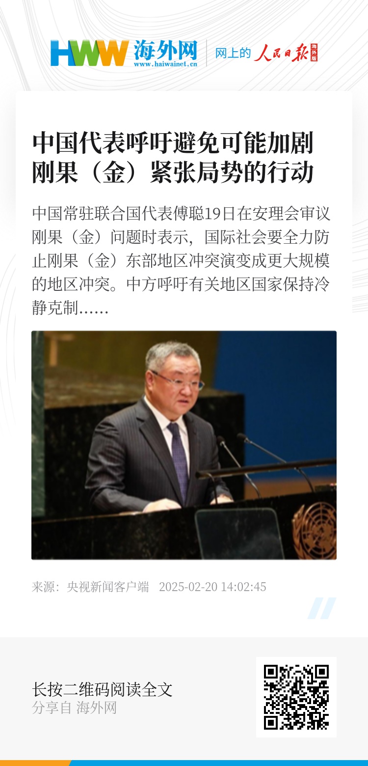 中国常驻联合国代表傅聪19日在安理会审议刚果(金)问题时表示,国际社会要全力防止刚果(金)东部地区冲突演变成更大规模的地区冲突。中方呼吁有关地区国家保持冷静克制,避免采取可能加剧紧张局势、激化各方矛盾的行动。