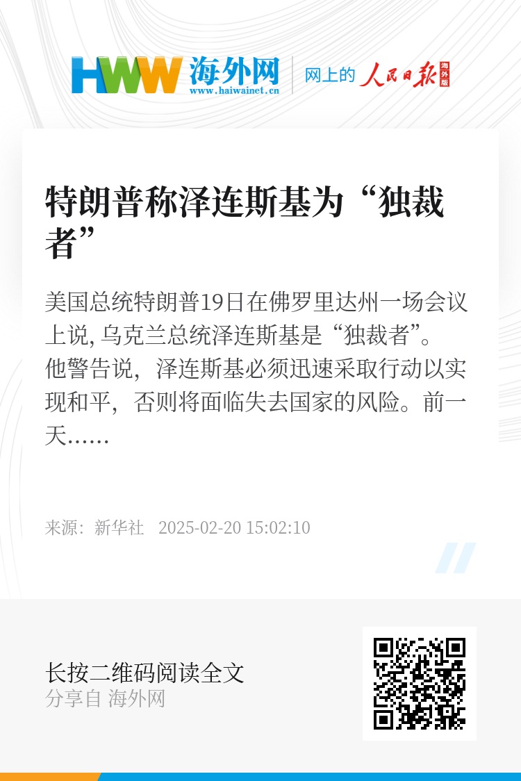 美国总统特朗普19日在佛罗里达州一场会议上说,乌克兰总统泽连斯基是 “独裁者”。他警告说,泽连斯基必须迅速采取行动以实现和平,否则将面临失去国家的风险。