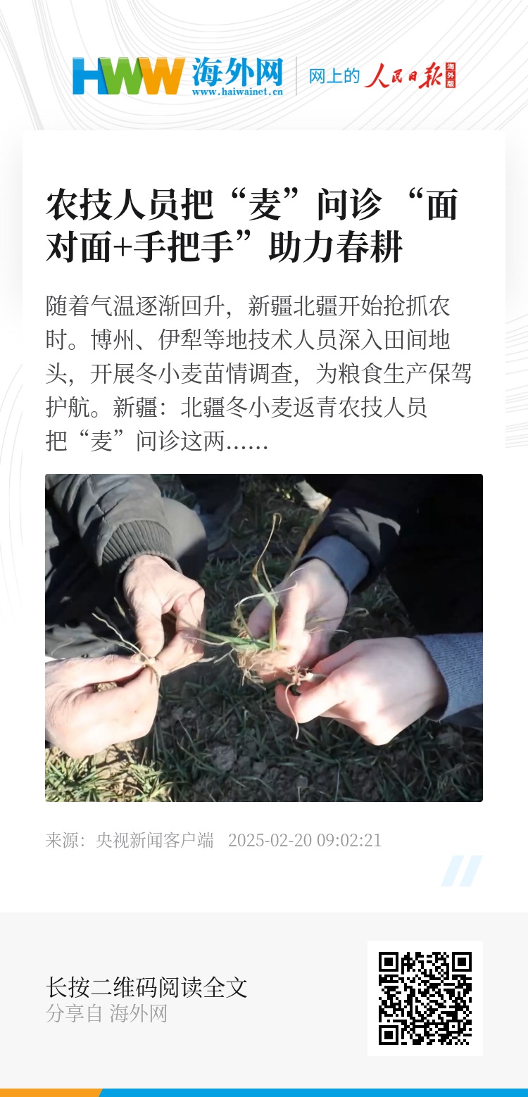 随着气温逐渐回升,新疆北疆开始抢抓农时。博州、伊犁等地技术人员深入田间地头,开展冬小麦苗情调查,为粮食生产保驾护航。