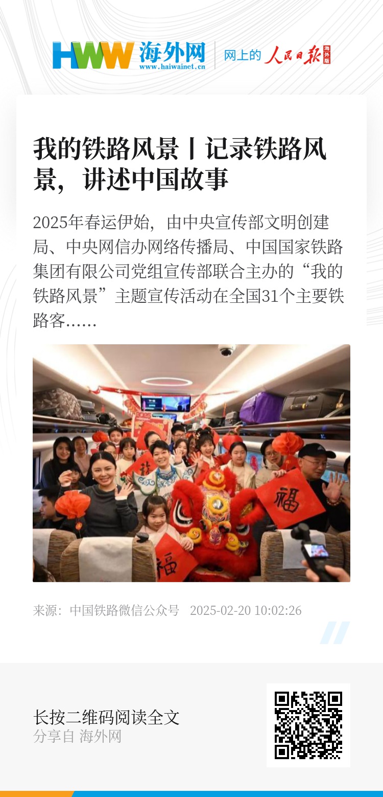 2025年春运伊始,由中央宣传部文明创建局、中央网信办网络传播局、中国国家铁路集团有限公司党组宣传部联合主办的“我的铁路风景”主题宣传活动在全国31个主要铁路客运车站同步启动,广大旅客积极参与,佳作频出,精彩纷呈。一张张照片、一个个短视频、一段段文字记录着春运路上的美丽“风景”,映射着当代中国的发展进步,讲述着生动鲜活的中国故事。