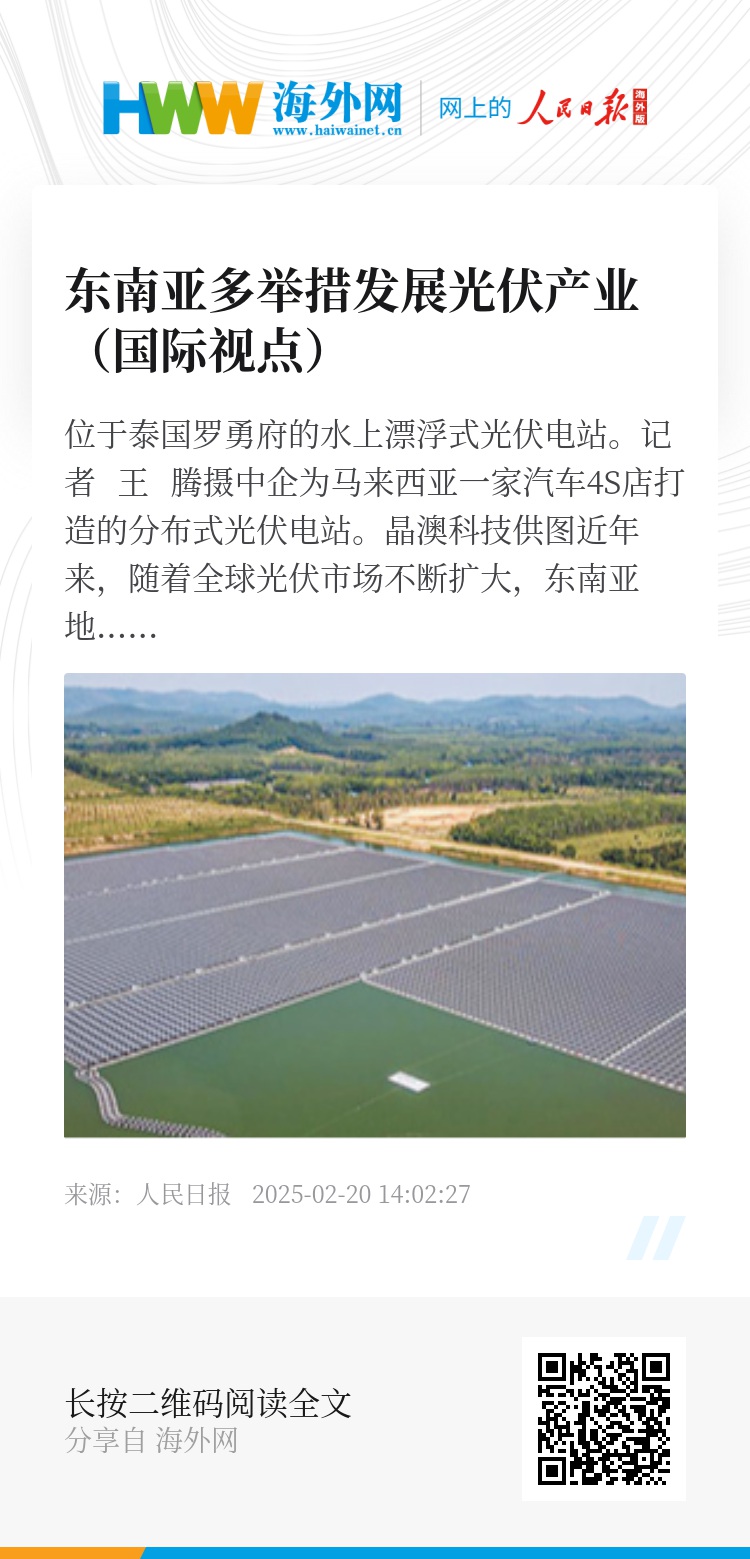 近年来,一批中国光伏企业走进东南亚市场,为当地绿色低碳发展和能源转型贡献力量。在印尼,由中国电力建设集团华东勘测设计研究院有限公司承建的漂浮光伏项目于2023年11月实现全容量并网发电,项目发电量占印尼新能源发电量的25%;在新加坡,由中国能源建设集团山西省电力勘测设计院有限公司总承包建设的浮体太阳能发电厂可以满足1.6万套四居室组屋的用电需求,每年为当地减少约3.2万吨碳排放……
