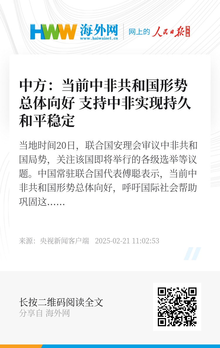 中方代表指出,中国一直是支持中非共和国发展的坚定伙伴,中方愿同中非共和国一道,落实两国领导人的共识,为中非共和国的发展繁荣和长治久安贡献力量。