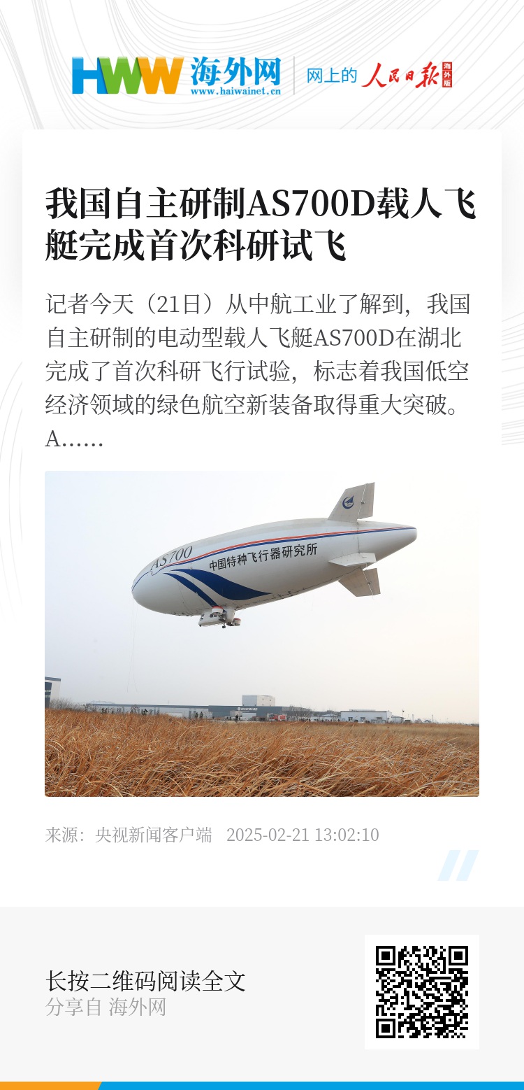 记者今天(21日)从中航工业了解到,我国自主研制的电动型载人飞艇AS700D在湖北完成了首次科研飞行试验,标志着我国低空经济领域的绿色航空新装备取得重大突破。