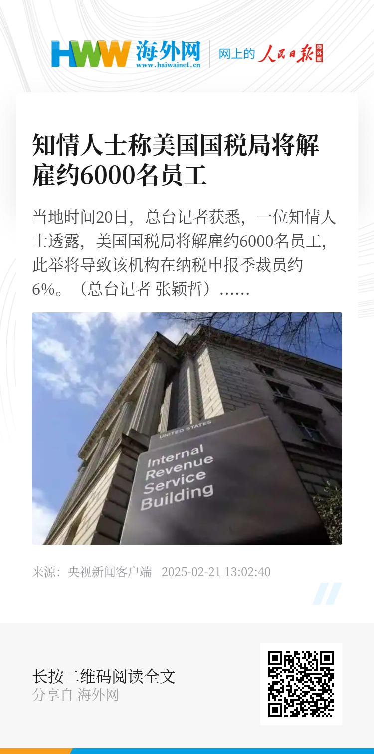 当地时间20日,总台记者获悉,一位知情人士透露,美国国税局将解雇约6000名员工,此举将导致该机构在纳税申报季裁员约6%。(总台记者 张颖哲)