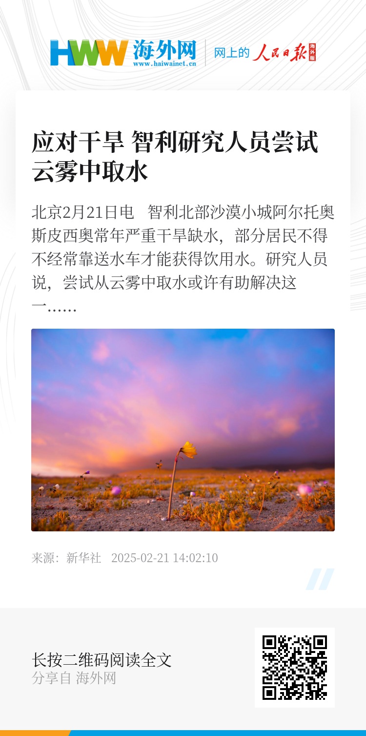 新华社北京2月21日电 智利北部沙漠小城阿尔托奥斯皮西奥常年严重干旱缺水,部分居民不得不经常靠送水车才能获得饮用水。研究人员说,尝试从云雾中取水或许有助解决这一问题。