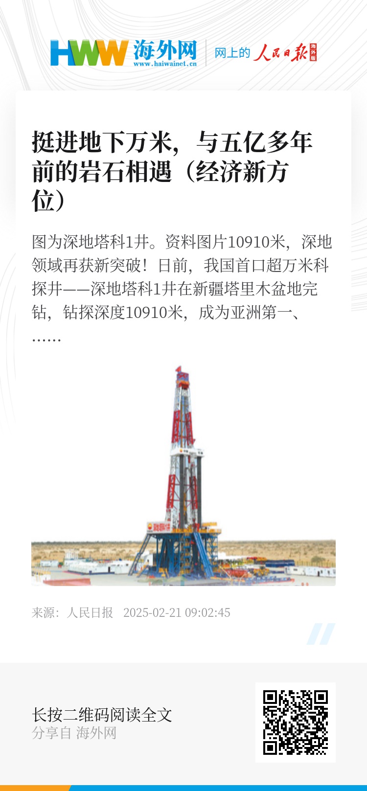 10910米不是终点。中国人向深地探索的脚步迈得更快、更远。(记者 丁怡婷)