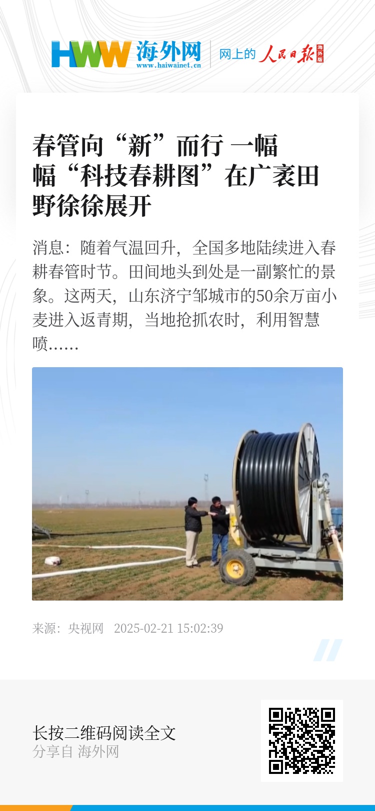 石墙镇面坊村种植户王昌松2025年种植了700亩小麦。他介绍,过去传统的大水漫灌每亩地要用水80立方米。现在用上了这种新型喷灌设备,每亩地用水减少到50多立方米,不仅节水,还降低了人工操作成本