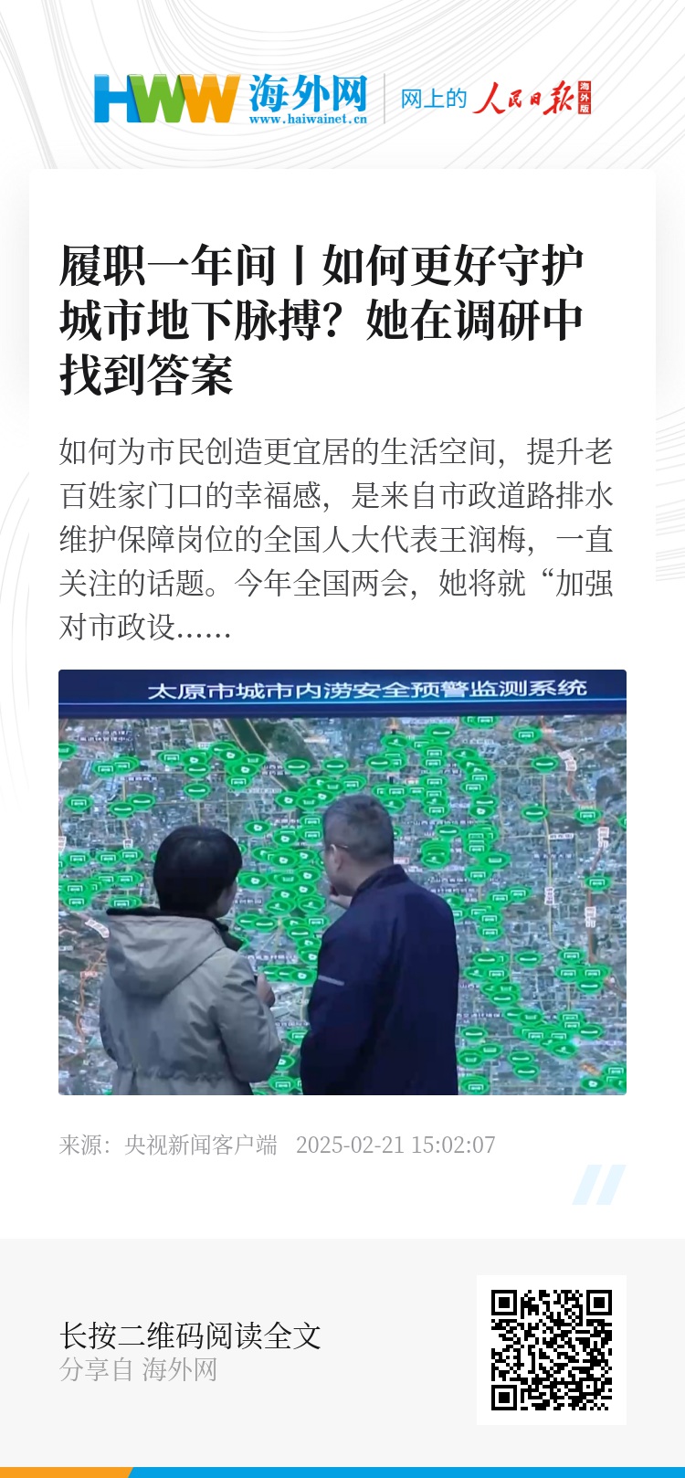 市政设施的不断改善和完善,服务的是生活在城市中的居民。目前,太原市的不少城市公共设施,正在进行数智化转型,去年还启用了基于超过700个地上监测点位的“城市内涝安全预警监测平台”。数字化、智能化,是未来城市市政基础设施建设的重要方向。走访调研中,大家纷纷建议,一线工作使用的设备工具,也需要迭代升级。