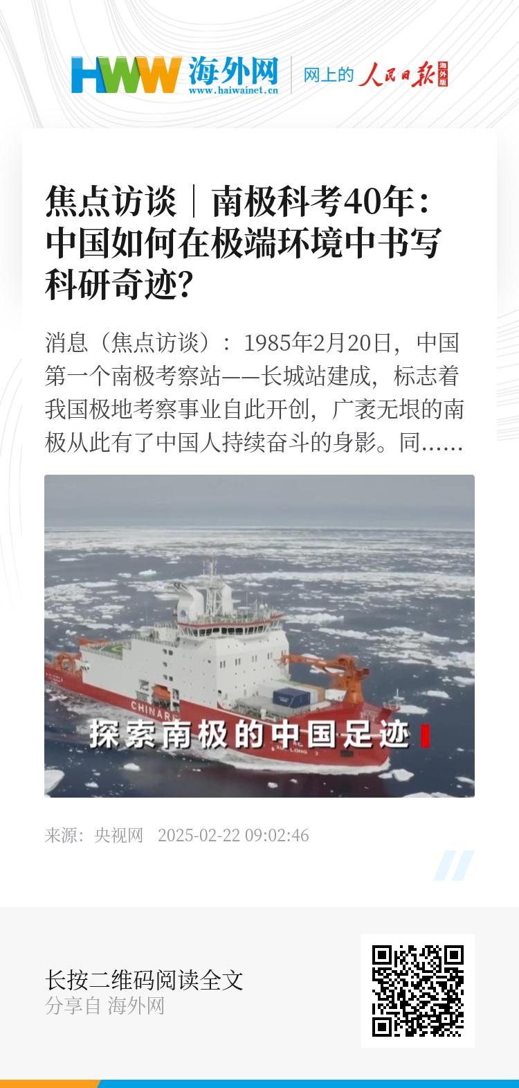 央视网消息(焦点访谈):1985年2月20日,中国第一个南极考察站——长城站建成,标志着我国极地考察事业自此开创,广袤无垠的南极从此有了中国人持续奋斗的身影。同年,中国成为《南极条约》协商国,在国际南极治理舞台上正式有了话语权。40年来,我国南极考察一路风雪兼程、筑梦冰原,取得了哪些成果?又面临着哪些挑战?