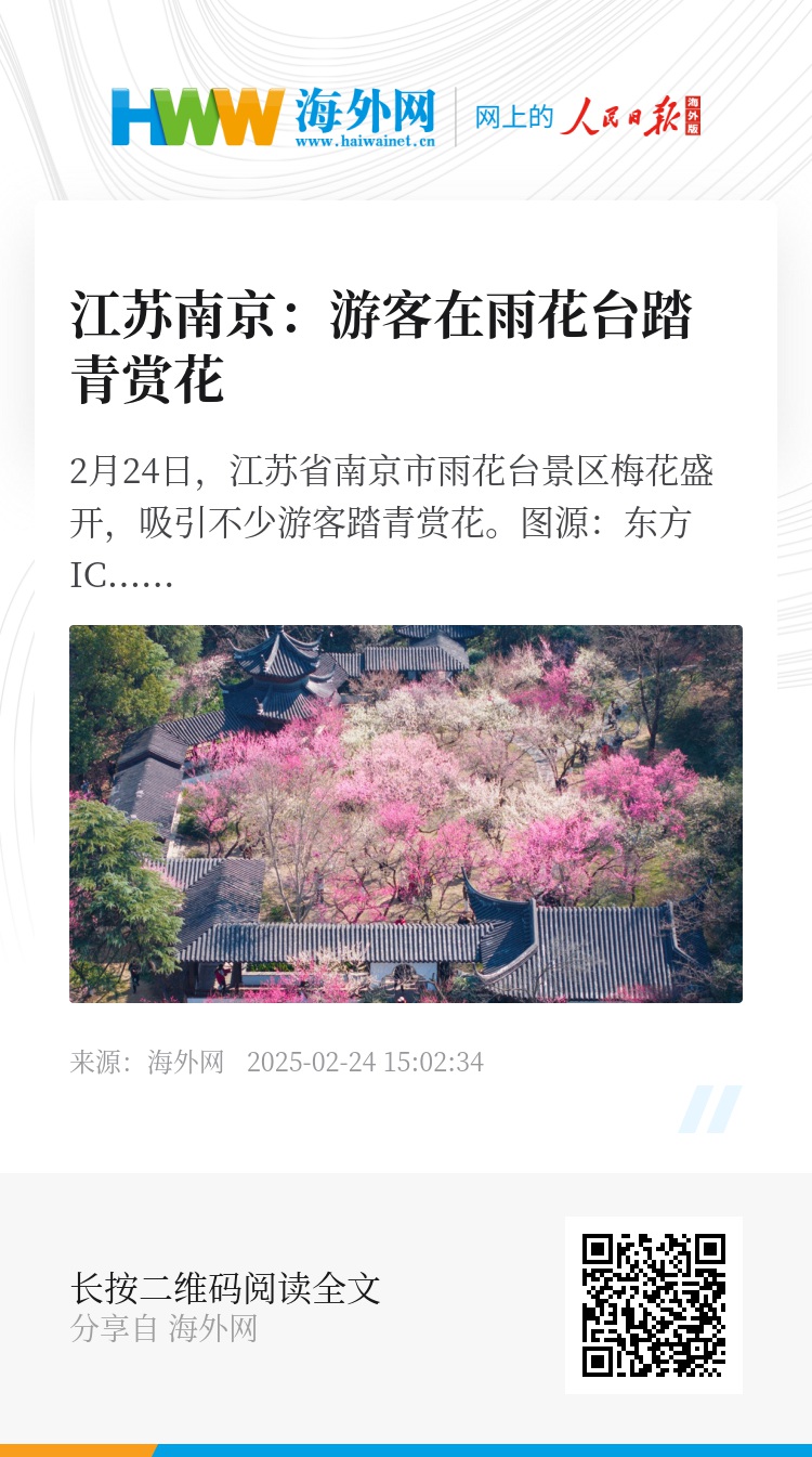 2月24日,江苏省南京市雨花台景区梅花盛开,吸引不少游客踏青赏花。图源:东方IC