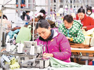 湖北省襄阳市保康县不断强化企业在资金、用工、科技创新等方面的保障力度,服务企业生产经营,激发经营主体活力,推动民营经济高质量发展。图为工人近日在保康县一家民营企业生产车间内加工服饰。杨韬 摄(人民视觉)