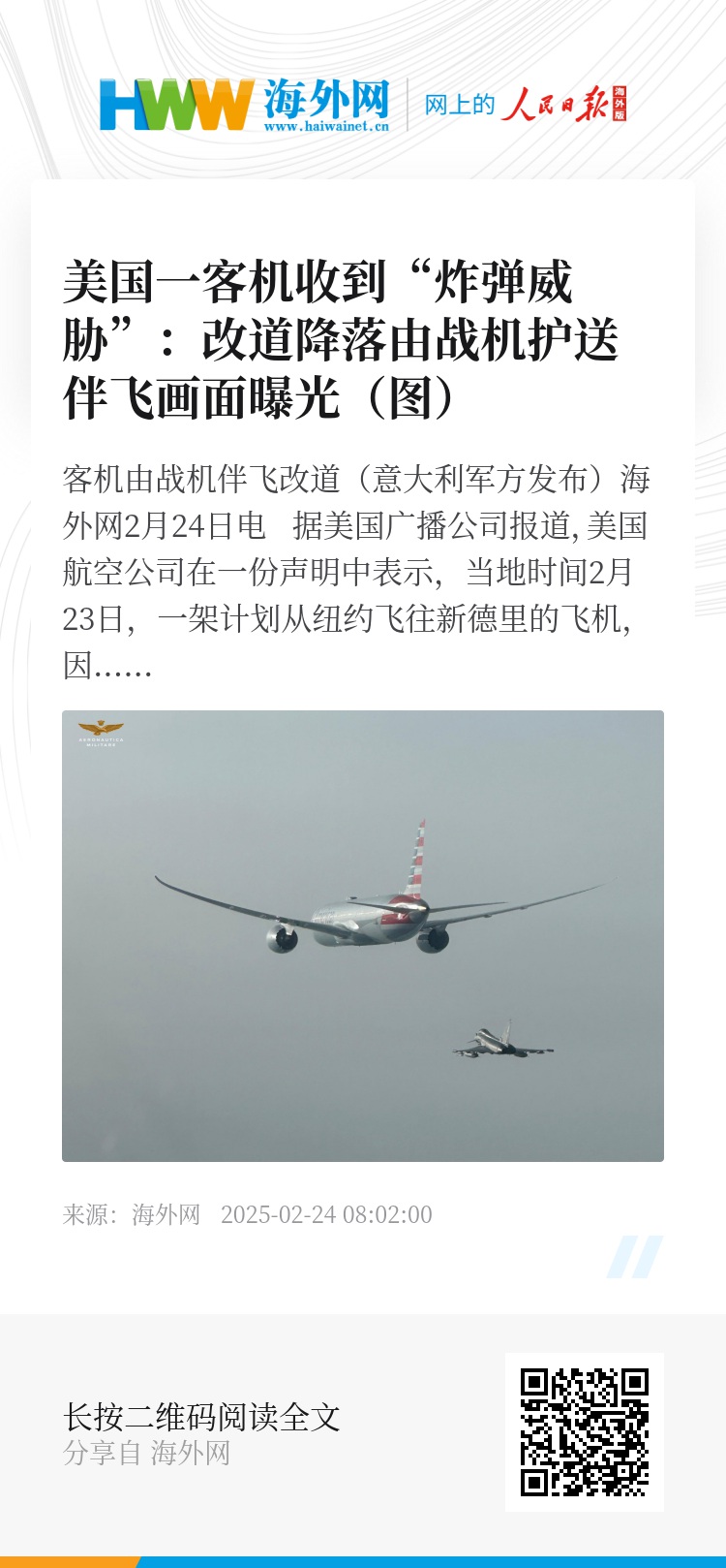 海外网2月24日电 据美国广播公司报道,美国航空公司在一份声明中表示,当地时间2月23日,一架计划从纽约飞往新德里的飞机,因“可能存在安全问题”,改道飞往罗马。