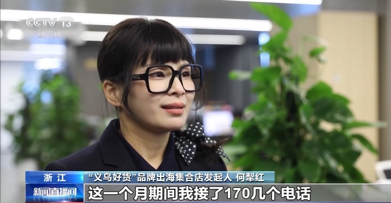 “义乌好货”品牌出海集合店发起人 何犁红:这一个月期间我接了170多个电话,28个国家的海外咨询要加盟,其实海外的客户非常关注这个模式,他们也觉得这个模式是他们想要的。