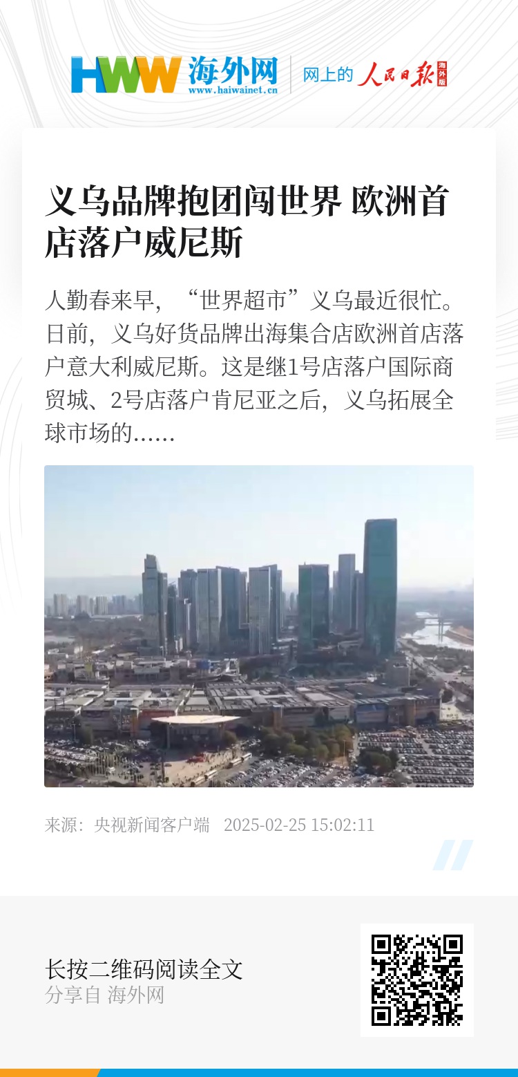 人勤春来早,“世界超市”义乌最近很忙。日前,义乌好货品牌出海集合店欧洲首店落户意大利威尼斯。这是继1号店落户国际商贸城、2号店落户肯尼亚之后,义乌拓展全球市场的又一举措,为2025年“义乌中国小商品城”品牌出海全球化战略赢得“开门红”。