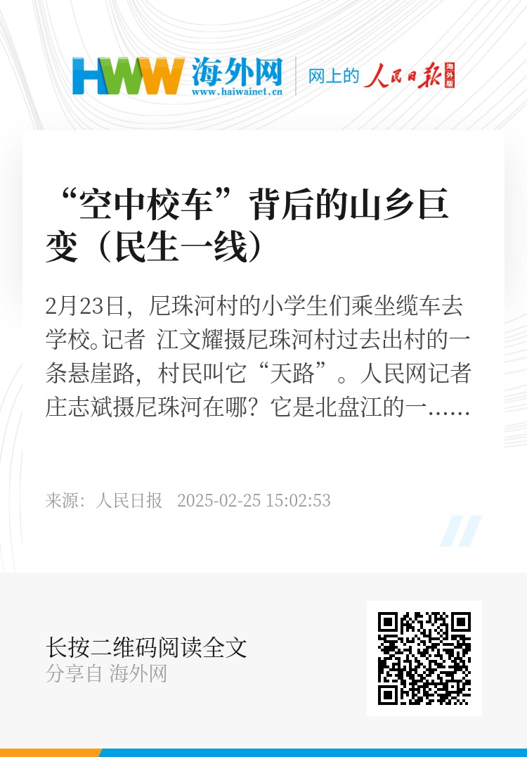 春节前夕,尼珠河村学生乘坐“电梯+高空缆车”上学的故事,让无数网友为之感动。近日,记者走进尼珠河村,探访“空中校车”背后“天堑变通途”的山乡巨变。