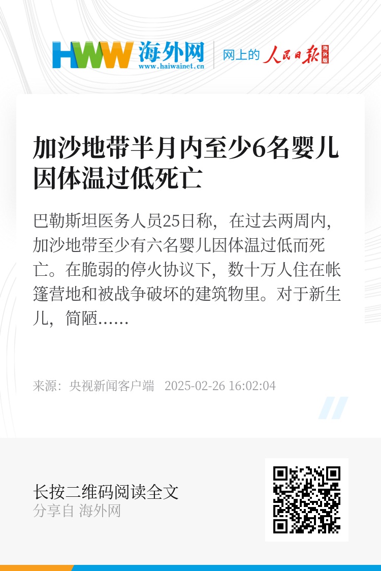 巴勒斯坦医务人员25日称,在过去两周内,加沙地带至少有六名婴儿因体温过低而死亡。在脆弱的停火协议下,数十万人住在帐篷营地和被战争破坏的建筑物里。对于新生儿,简陋的生活条件,让他们的成长之路异常坎坷。