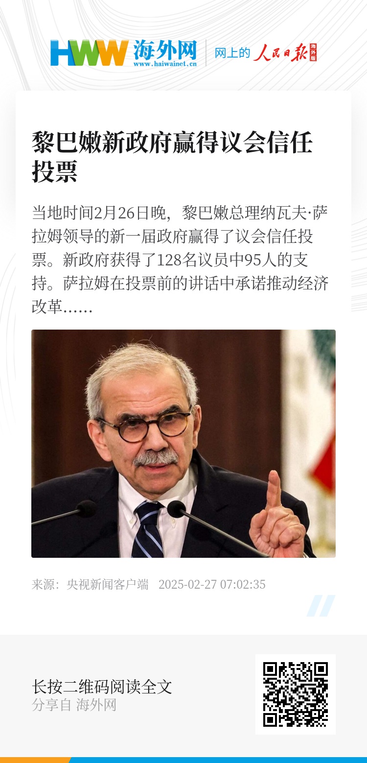 当地时间2月26日晚,黎巴嫩总理纳瓦夫·萨拉姆领导的新一届政府赢得了议会信任投票。新政府获得了128名议员中95人的支持。