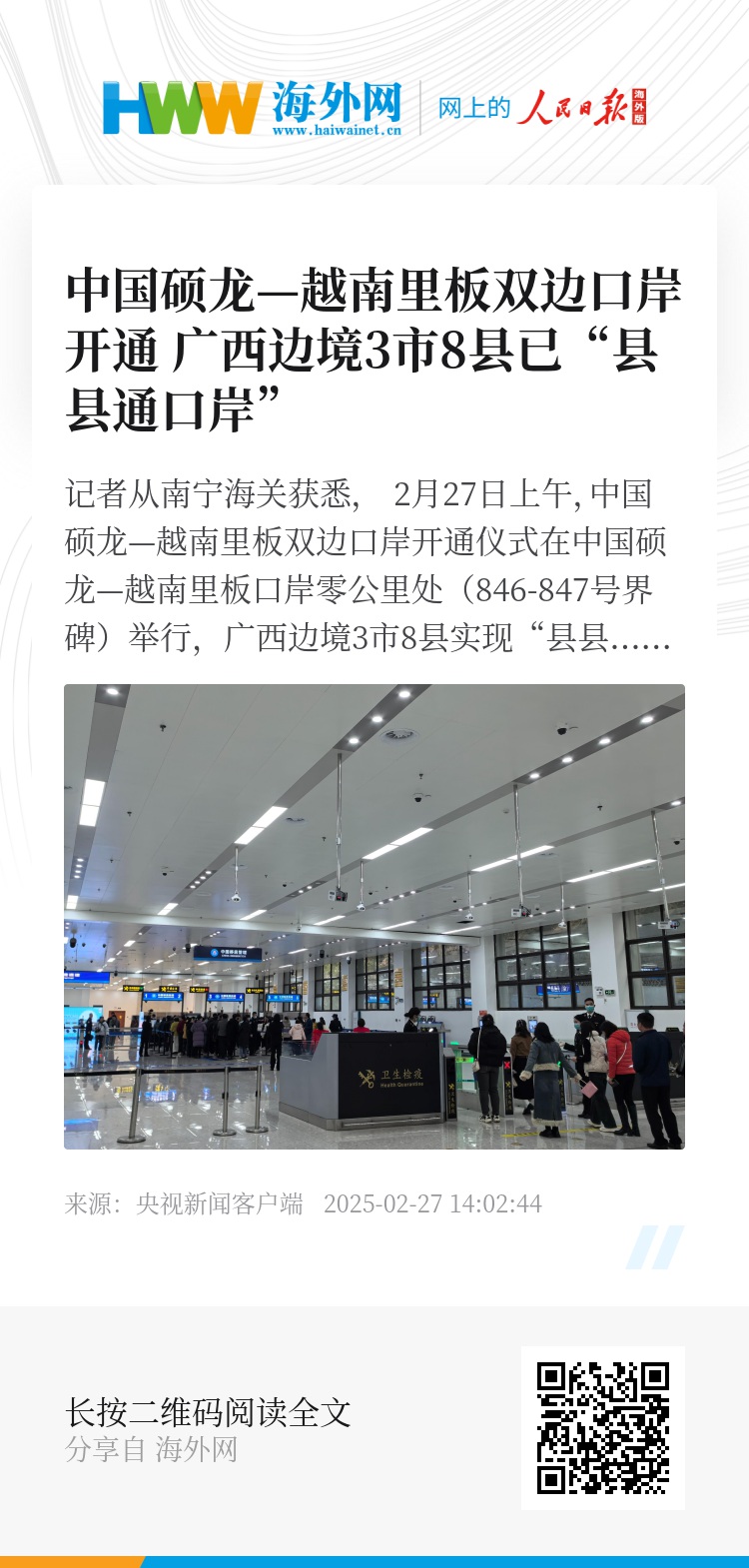 记者从南宁海关获悉, 2月27日上午,中国硕龙—越南里板双边口岸开通仪式在中国硕龙—越南里板口岸零公里处(846-847号界碑)举行,广西边境3市8县实现“县县通口岸”。