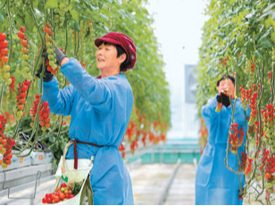 近年来,江苏省南通市通州区大力推动智慧设施农业、生态高效农业园区发展,促进农业生产提质增效。图为通州区十总镇圆宏万嘉智慧农业基地的智能大棚内,工人在采摘成熟的小番茄。翟慧勇 摄(人民视觉)