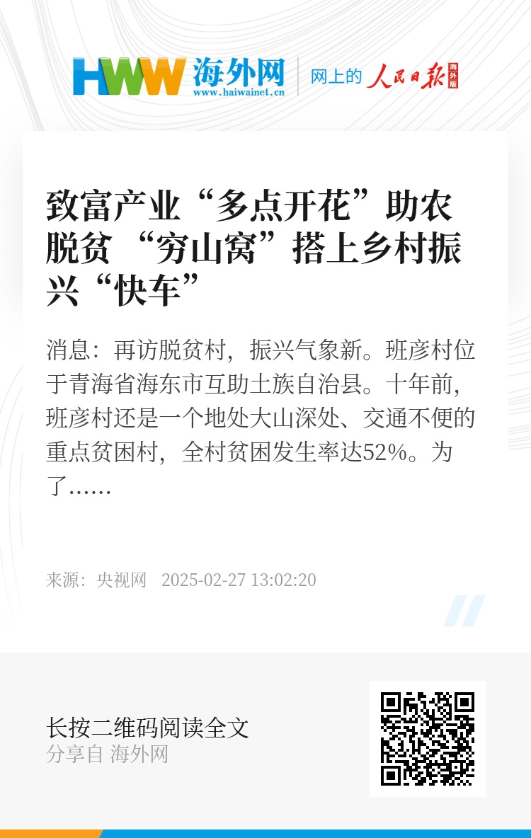 央视网消息:再访脱贫村,振兴气象新。班彦村位于青海省海东市互助土族自治县。十年前,班彦村还是一个地处大山深处、交通不便的重点贫困村,全村贫困发生率达52%。为了让村民走出“穷山窝”,2017年,班彦村完成了易地扶贫搬迁,之后因地制宜发展土族盘绣、绿色光伏等多个特色产业。2021年,班彦村获得“全国脱贫攻坚楷模”荣誉称号。如今,这里的村民们过得怎么样?