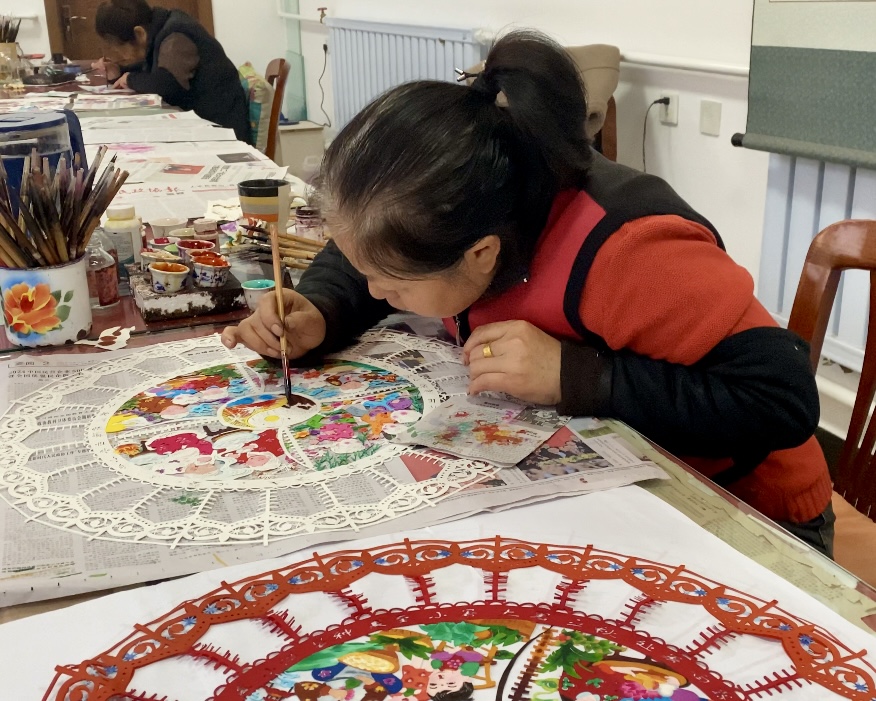 南张庄村阿姨正在点染剪纸。邢建荣 摄