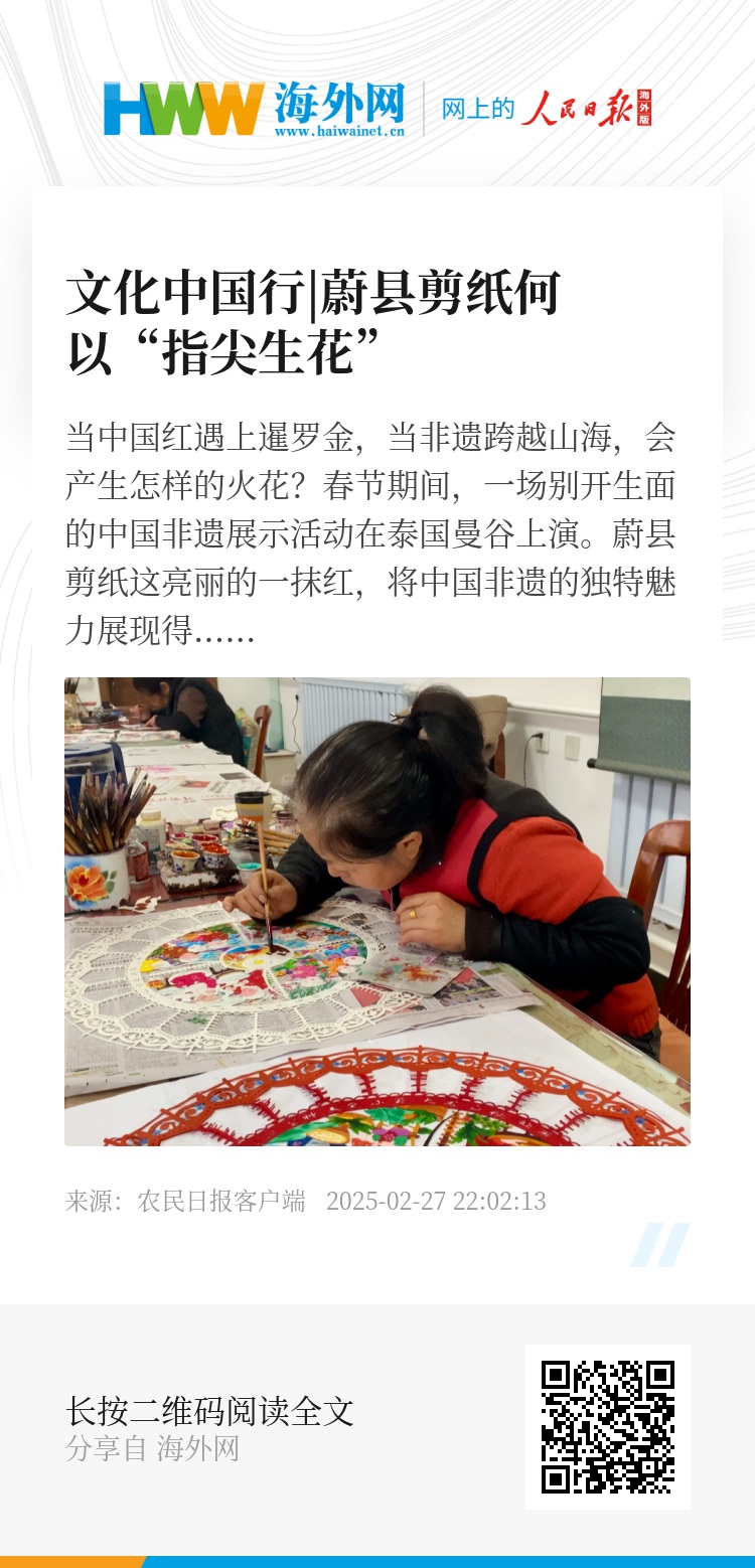 当中国红遇上暹罗金,当非遗跨越山海,会产生怎样的火花?春节期间,一场别开生面的中国非遗展示活动在泰国曼谷上演。蔚县剪纸这亮丽的一抹红,将中国非遗的独特魅力展现得淋漓尽致。