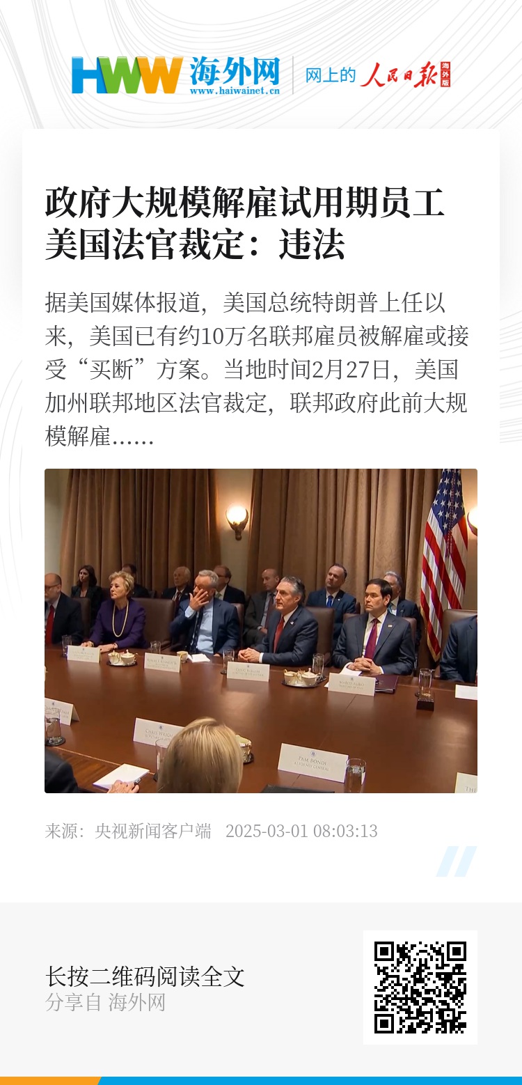 据美国《华盛顿邮报》报道,加利福尼亚州联邦地区法官威廉·阿尔苏普27日支持美国政府雇员联合会等工会组织诉求,裁定联邦政府先前大规模解雇试用期员工的做法违法,勒令美国人事管理局撤回2月中旬针对国防部等20多个联邦机构所发的裁员指令。