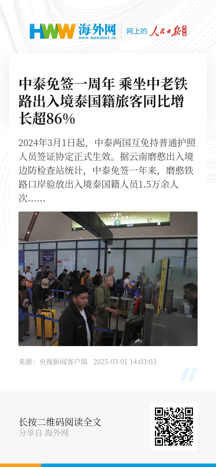 2024年3月1日起,中泰两国互免持普通护照人员签证协定正式生效。据云南磨憨出入境边防检查站统计,中泰免签一年来,磨憨铁路口岸验放出入境泰国籍人员1.5万余人次,同比增长超86%,交流交往日益密切。