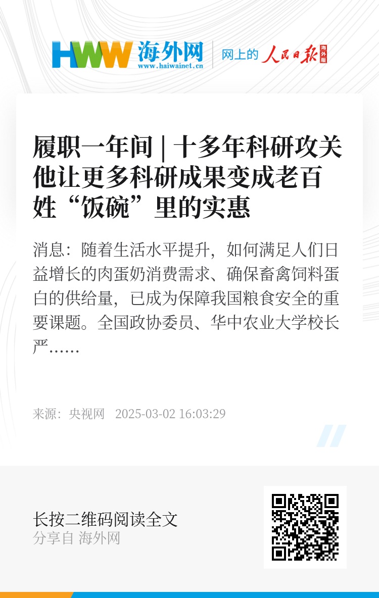 央视网消息:随着生活水平提升,如何满足人们日益增长的肉蛋奶消费需求、确保畜禽饲料蛋白的供给量,已成为保障我国粮食安全的重要课题。全国政协委员、华中农业大学校长严建兵,一直以来致力于用高蛋白玉米替代大豆饲料的研究工作。近年来数十次往返于全国各地的玉米试验田和下游技术应用企业之间,在提高玉米蛋白含量、增加产量等方面取得了多个成果。今年两会,他也带来了自己的调研成果。