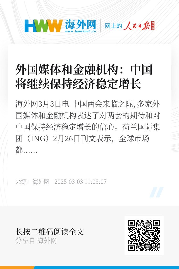 海外网3月3日电 中国两会来临之际,多家外国媒体和金融机构表达了对两会的期待和对中国保持经济稳定增长的信心。
