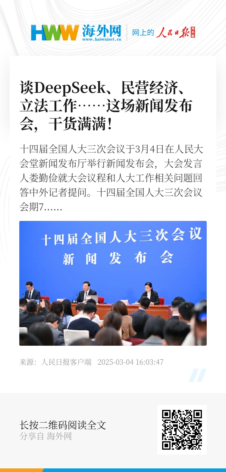 娄勤俭说,DeepSeek公司取得的重大进展,代表着一批中国公司在人工智能领域的崛起,由中青年组成的主创团队正在挑起中国科技事业进步的大梁,值得点赞。DeepSeek公司坚持开放开源的技术路线,开源共享推动了人工智能技术在全球的普遍应用,为世界贡献了“中国智慧”。通过DeepSeek这类公司的兴起,我们可以看到中国在科技发展上的创新性和包容性。