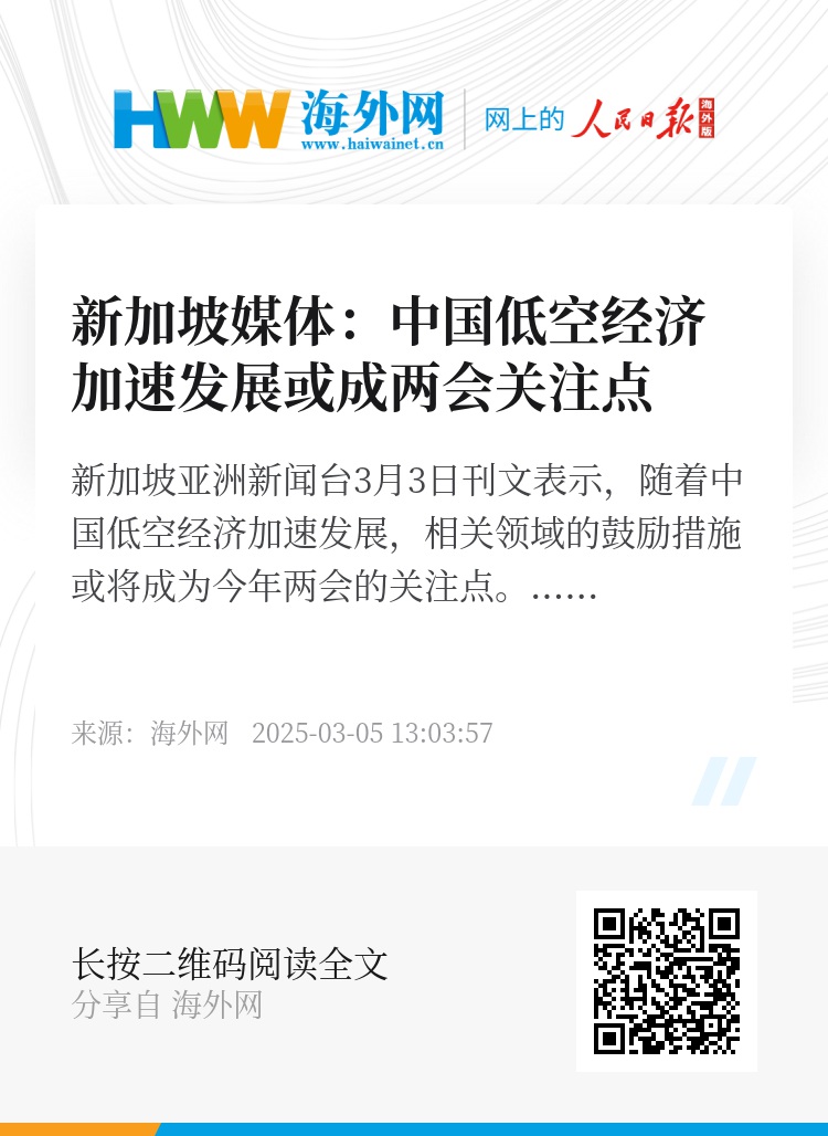 海外网3月5日电 新加坡亚洲新闻台3日刊文表示,随着中国低空经济加速发展,相关领域的鼓励措施或将成为今年两会的关注点。
