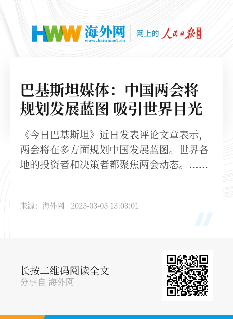 海外网3月5日电 《今日巴基斯坦》近日发表评论文章表示,两会将在多方面规划中国发展蓝图。世界各地的投资者和决策者都聚焦两会动态。