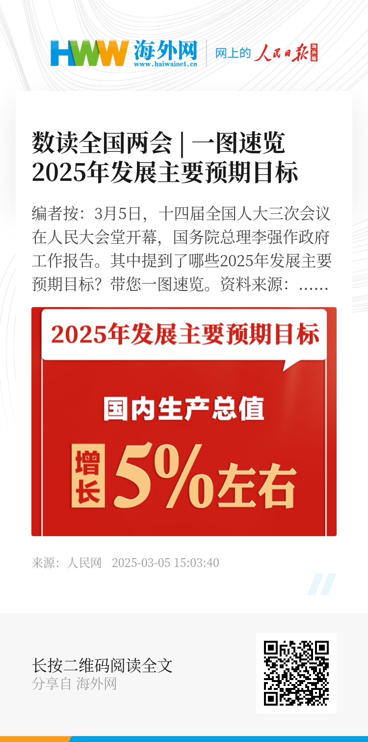 编者按:3月5日,十四届全国人大三次会议在人民大会堂开幕,国务院总理李强作政府工作报告。其中提到了哪些2025年发展主要预期目标?人民网带您一图速览。