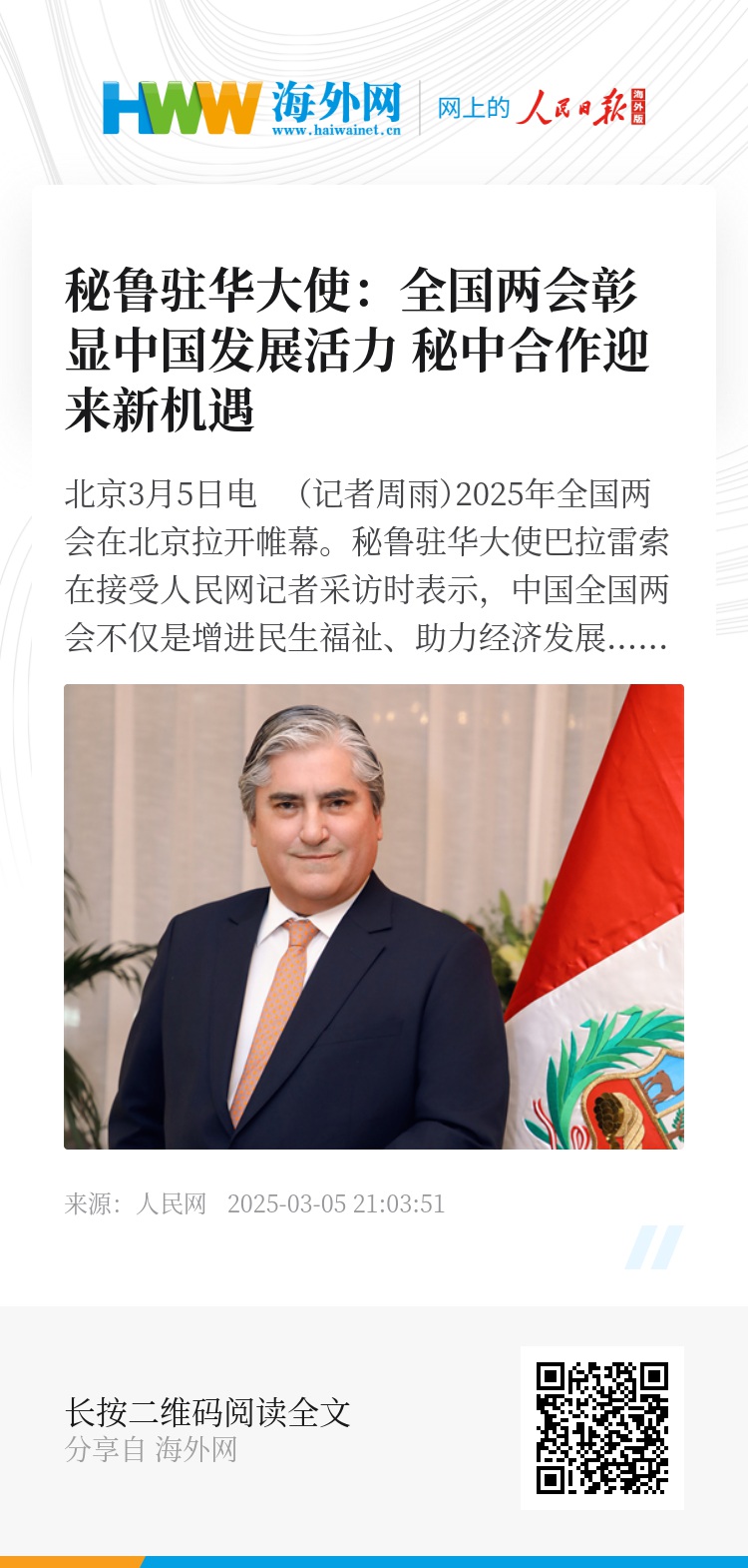 人民网北京3月5日电 (记者周雨)2025年全国两会在北京拉开帷幕。秘鲁驻华大使巴拉雷索在接受人民网记者采访时表示,中国全国两会不仅是增进民生福祉、助力经济发展的重要平台,更是倾听各界声音、彰显中国发展活力的关键窗口。