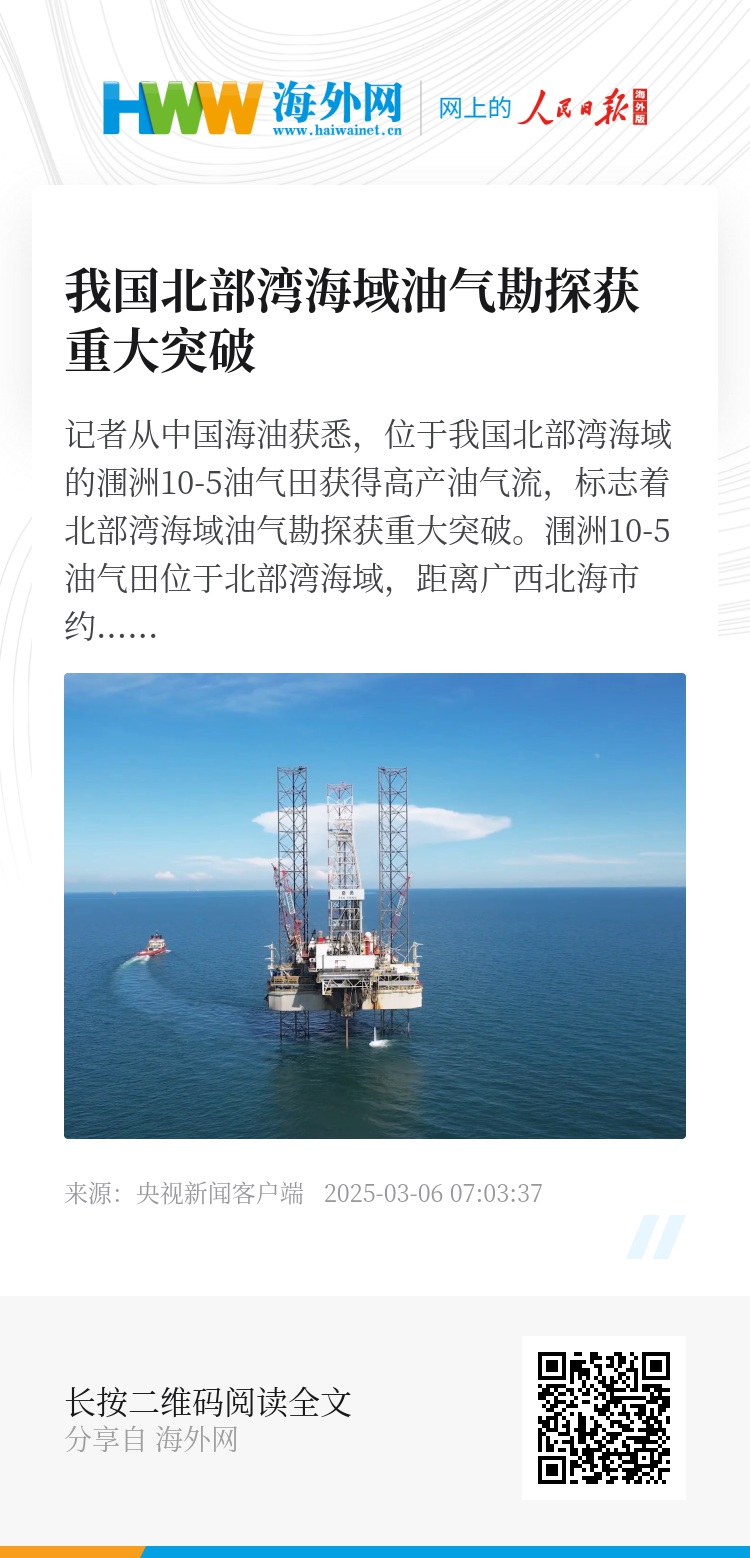 记者从中国海油获悉,位于我国北部湾海域的涠洲10-5油气田获得高产油气流,标志着北部湾海域油气勘探获重大突破。