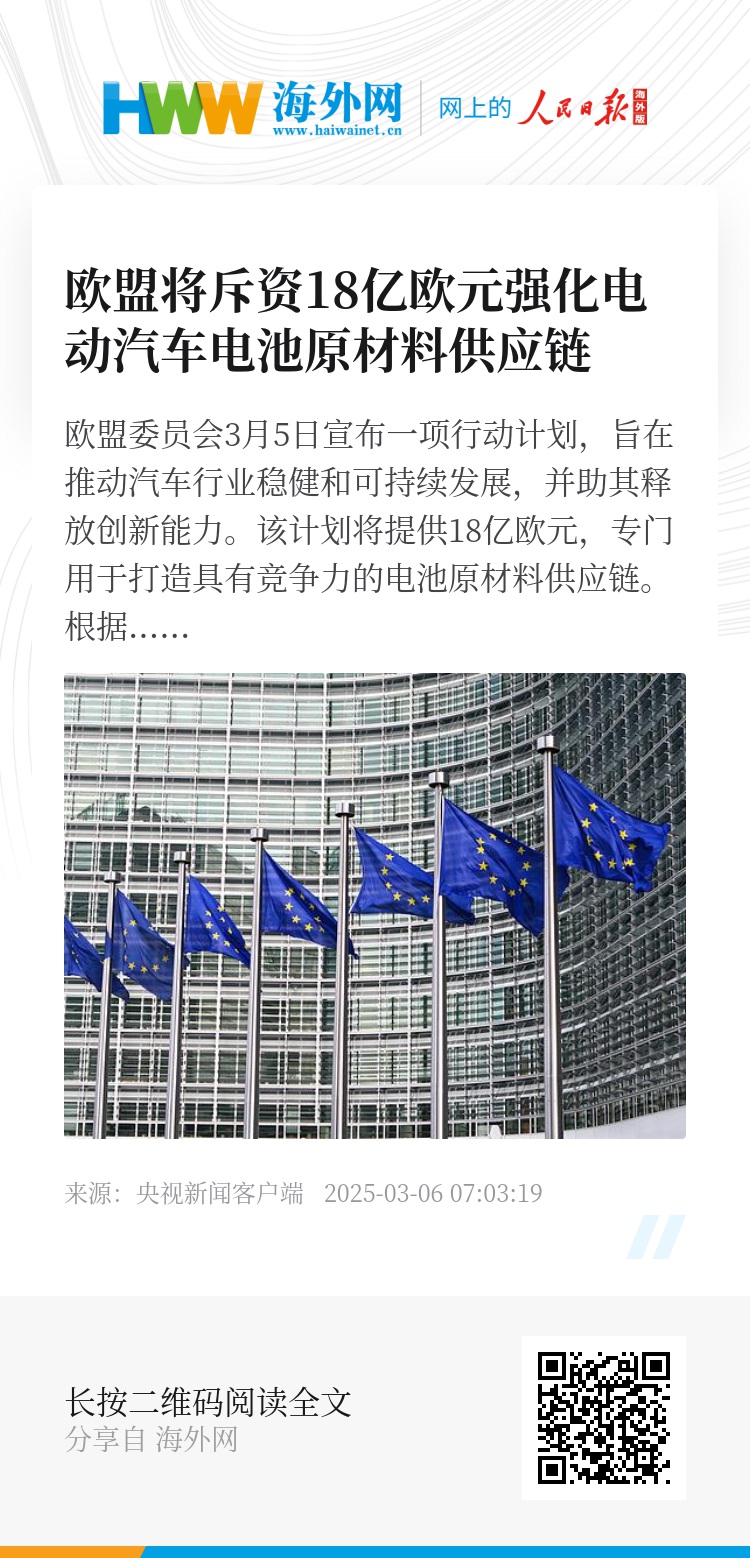 欧盟委员会3月5日宣布一项行动计划,旨在推动汽车行业稳健和可持续发展,并助其释放创新能力。该计划将提供18亿欧元,专门用于打造具有竞争力的电池原材料供应链。