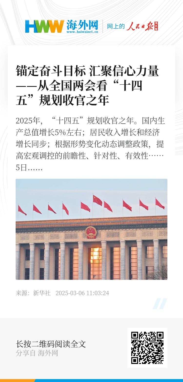国内生产总值增长5%左右;居民收入增长和经济增长同步;根据形势变化动态调整政策,提高宏观调控的前瞻性、针对性、有效性……5日提请十四届全国人大三次会议审议的政府工作报告,按照党中央决策部署,明确今年我国发展主要预期目标和宏观政策取向,部署政府工作任务。