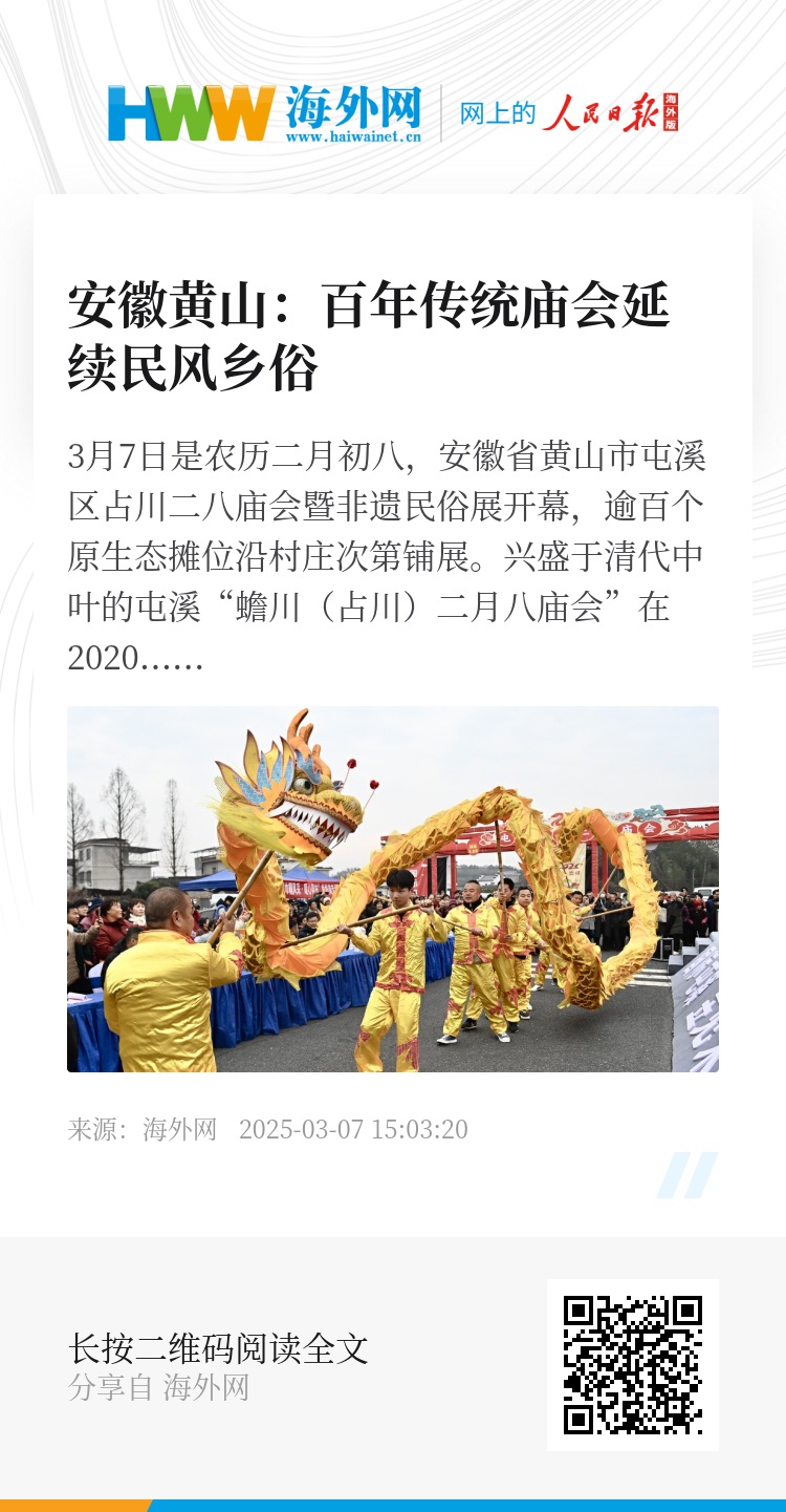 3月7日是农历二月初八,安徽省黄山市屯溪区占川二八庙会暨非遗民俗展开幕,逾百个原生态摊位沿村庄次第铺展。兴盛于清代中叶的屯溪“蟾川(占川)二月八庙会”在2020年被列入黄山市第六批非物质文化遗产项目。图源:IC photo/中新社记者 韩苏原 摄