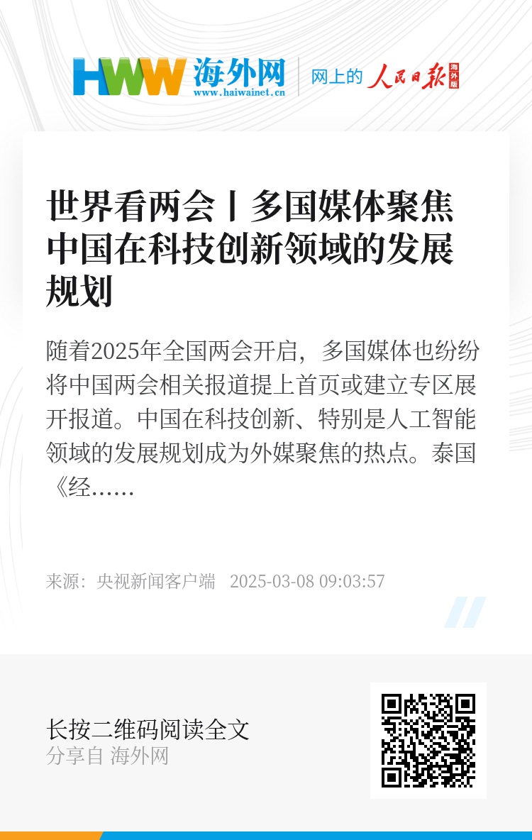 随着2025年全国两会开启,多国媒体也纷纷将中国两会相关报道提上首页或建立专区展开报道。中国在科技创新、特别是人工智能领域的发展规划成为外媒聚焦的热点。