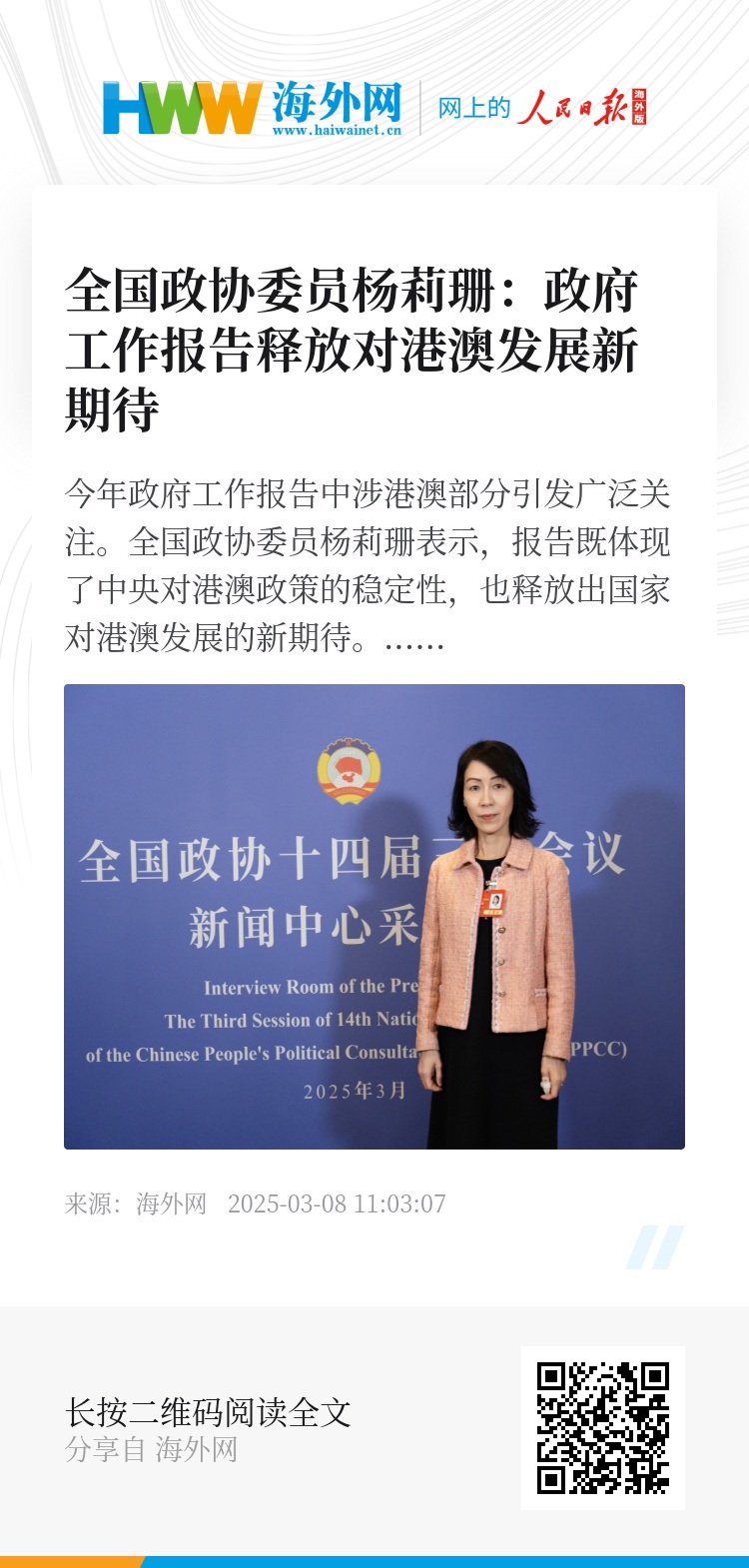 海外网3月8日电 今年政府工作报告中涉港澳部分引发广泛关注。全国政协委员杨莉珊表示,报告既体现了中央对港澳政策的稳定性,也释放出国家对港澳发展的新期待。