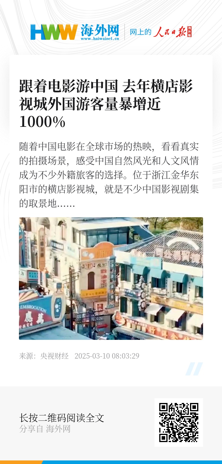 随着我国全面放宽优化过境免签政策的实施,叠加持续高涨的“电影热”,横店影视城2024年接待外国游客数量同比增长近10倍。