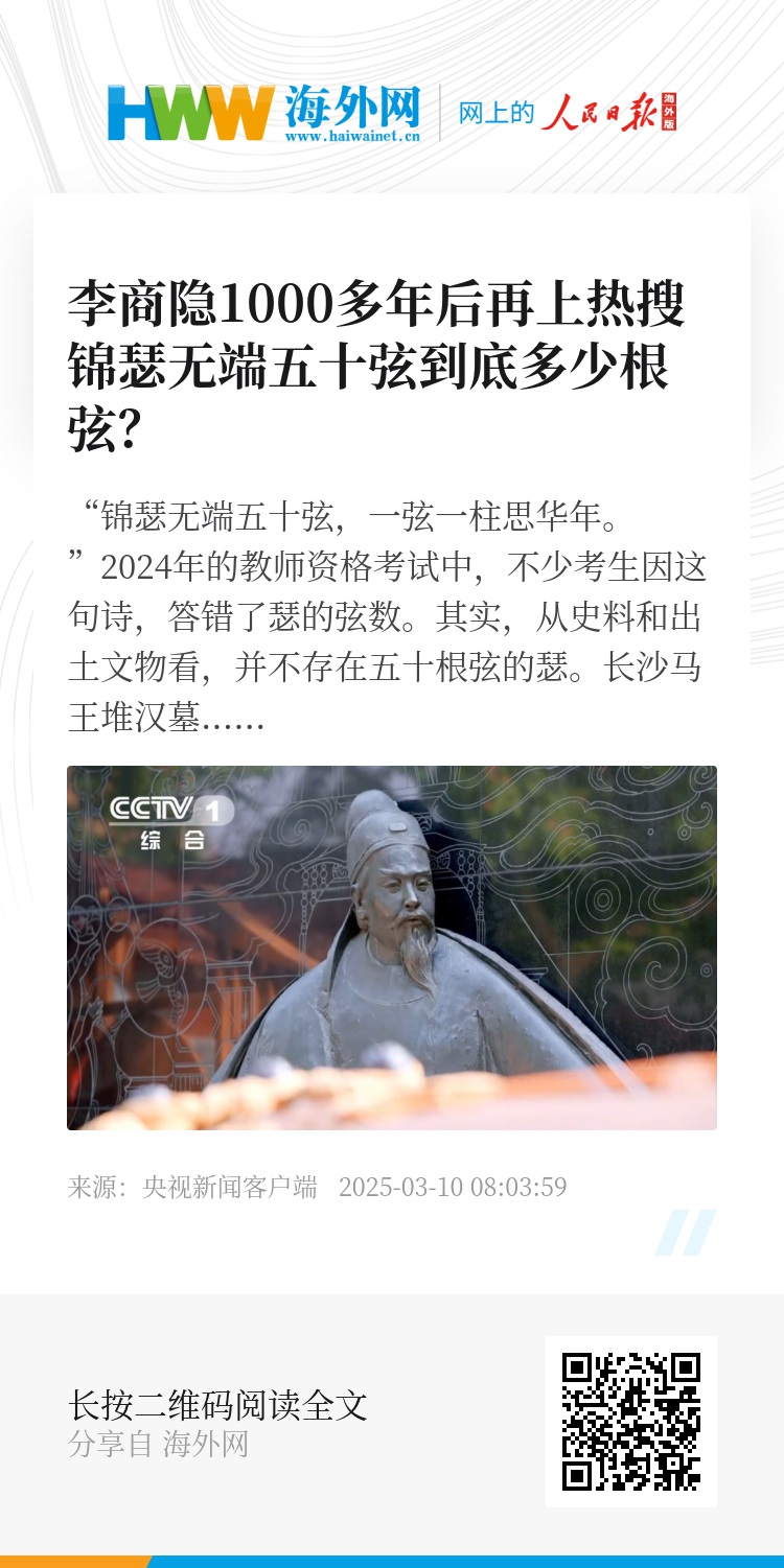 “锦瑟无端五十弦,一弦一柱思华年。”2024年的教师资格考试中,不少考生因这句诗,答错了瑟的弦数。其实,从史料和出土文物看,并不存在五十根弦的瑟。长沙马王堆汉墓出土的黑漆二十五弦瑟,是迄今为止发现的唯一完整的西汉初期瑟。那么,李商隐为什么要把二十五弦说成五十弦?